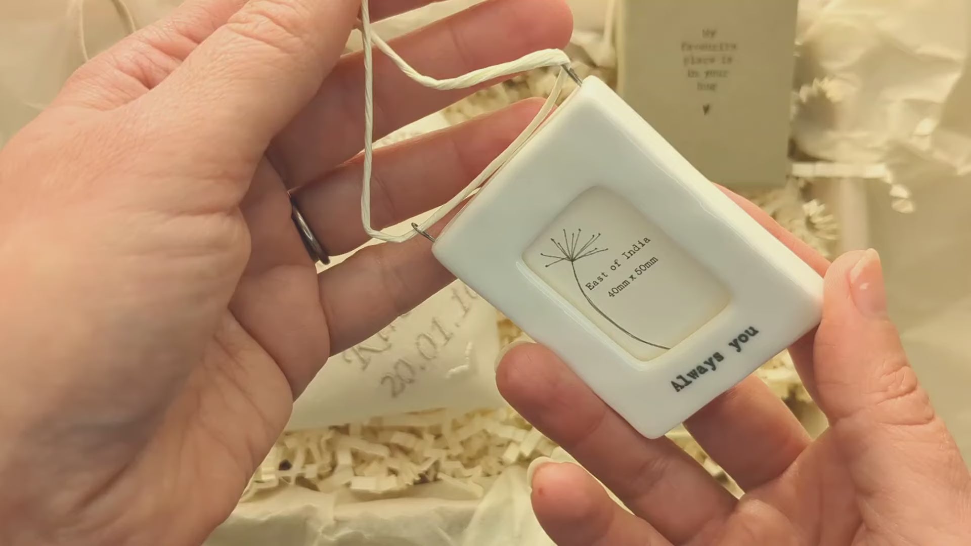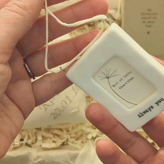 Gift box also includes, a mini porcelain photo frame, with the text, 'Always you' on the front, and on the back, 'My favourite place is in your hug'. (approx. 7.5 x 5.5 x 2cm)