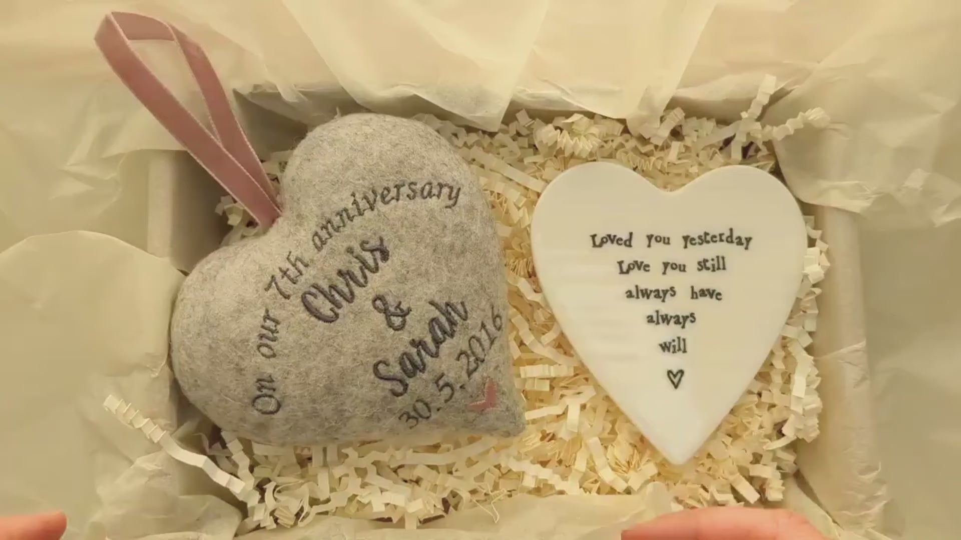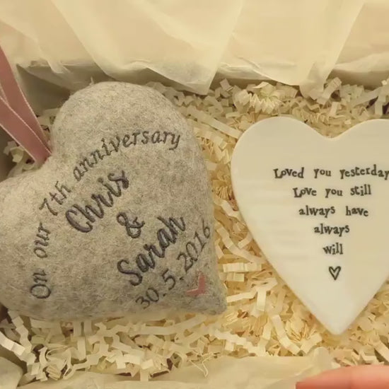 Celebrate 7 years of marriage with our personalised 7th wool anniversary embroidered heart. A grey heart made with 100% wool felt, personalised with your choice of message, names and date, embroidered in dark grey thread. Underneath the text a little heart is embroidered in your choice of 7 coloured thread. The heart is finished with a grey velvet hanging ribbon. Choose from seven thread colours for the embroidered heart under the date (shown as pale pink in the photograph.) Colours available: dark red, navy blue, pale pink, blue, cream, purple, and green. Dimensions approx. W14cm x L13cm ribbon 9cm