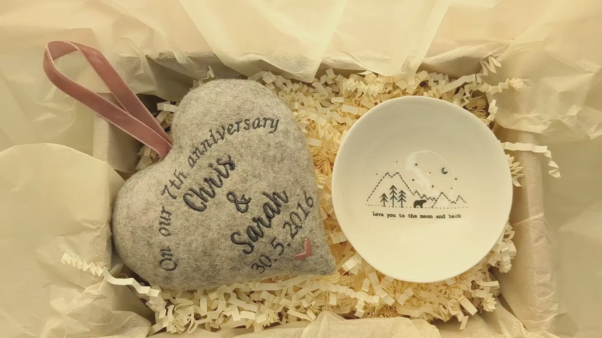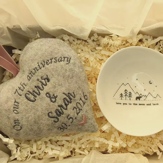 This personalised 7th wedding anniversary gift box includes a 100% wool felt heart adorned with custom embroidery and a pink velvet ribbon. The heart measures approximately 14 cm by 13 cm, with the ribbon measuring 9 cm. A wobbly bowl featuring the phrase “Love you to the moon and back” is also included, dimensions approx. 10cm x 3.3cm x 10cm. It's boxed with an ivory gift bow and gift tag, allowing for a special message. Box approx. 8.5 cm by 15.5 cm by 24 cm.