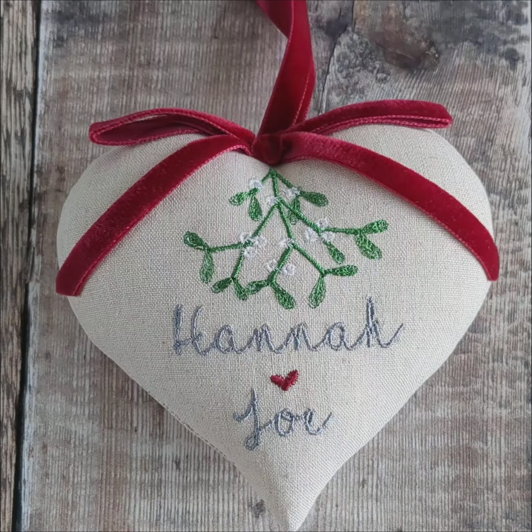 A gorgeous Christmas hanging heart decoration for a special couple. A beige, linen and cotton mix fabric heart, embroidered with a festive mistletoe bunch and two names with a little red heart between them. Finished with a velvet red ribbon and bow. A perfect way to celebrate Christmas as a couple. Dimensions approx. W14cm x L13cm ribbon 9cm