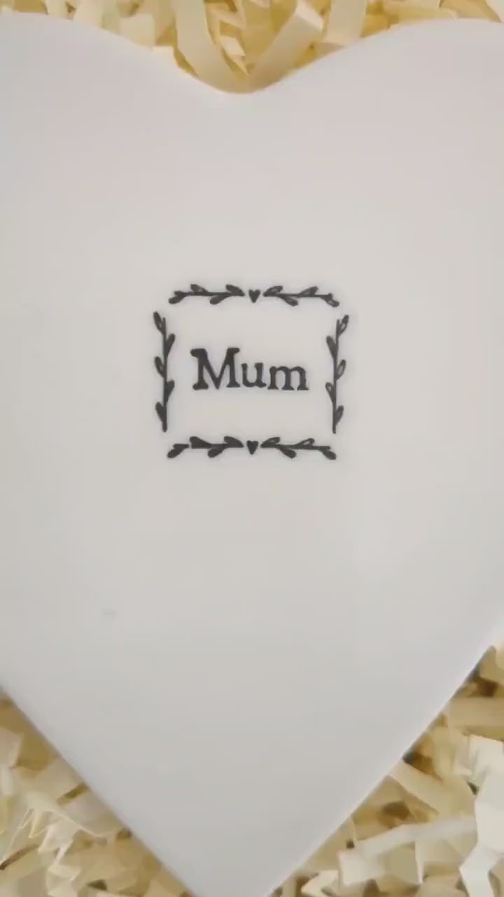 A gorgeous porcelain heart coaster with 'Mum' and a little border detailing around in black. Dimensions approx. W10cm x L10cm