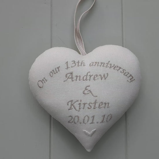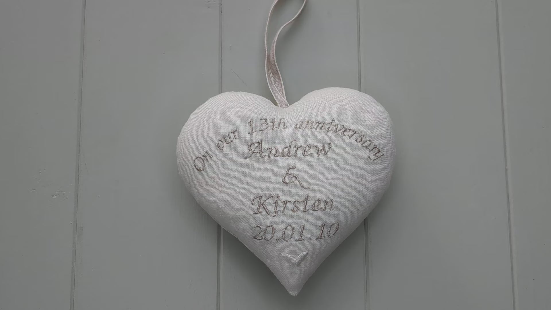 Celebrate your 13th wedding anniversary with our classic personalised lace heart, a perfect tribute to the traditional lace anniversary gift. This beautiful keepsake is embroidered with your custom message, names, and special date in beige thread, accompanied by a delicate, tiny embroidered heart.