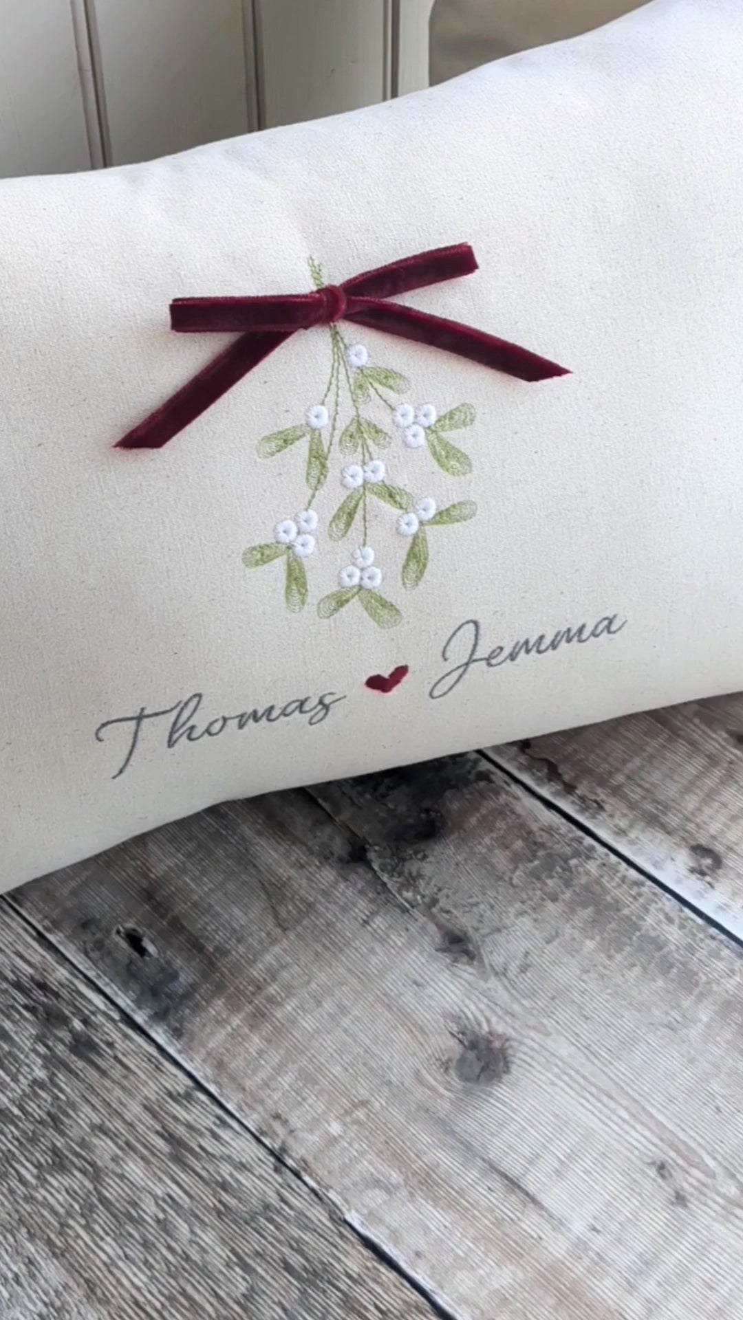 This personalised Christmas Cushion features embroidered mistletoe in green and white, and a rich, red velvet bow to complete the cushion. Personalise it with two names, separated by an embroidered red heart, all done with sustainably sourced threads. The cushion cover is woven from a fair-trade, cream cotton canvas with a cream zipper closure. Purchase just the cover or choose the option with the microfibre cushion pad included. Perfect for gifting to a special couple this holiday season. Dimensions of the cover: 50cm x 30cm approx. Dimensions of the pad: 50cm x 35cm approx.