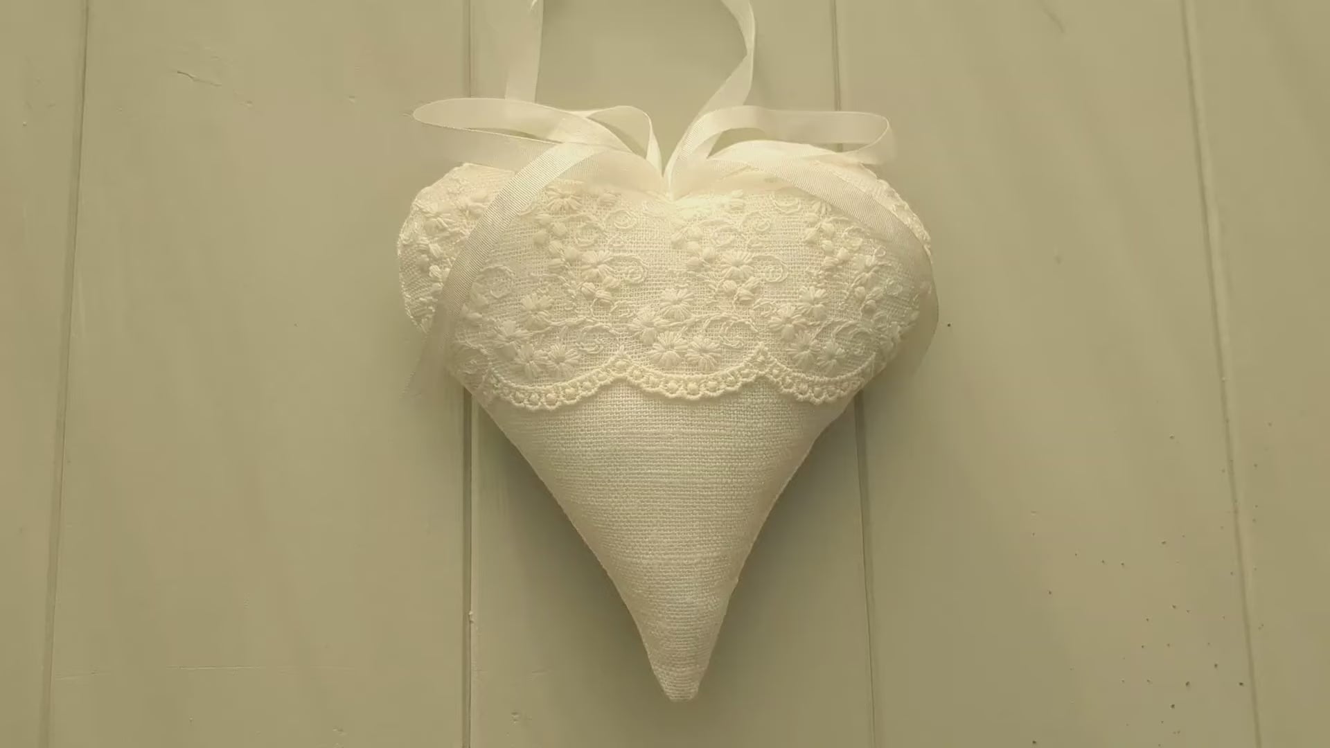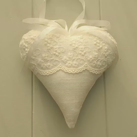 Celebrate your wedding anniversary with our personalised, embroidered linen and lace hanging heart. Made with ivory fabric and delicate lace, this heart features your custom message (up to 45 characters) in grey thread. It's a beautiful keepsake, measuring 15cm x 14cm, complete with a silk hanging ribbon. A perfect gift to cherish for years to come.