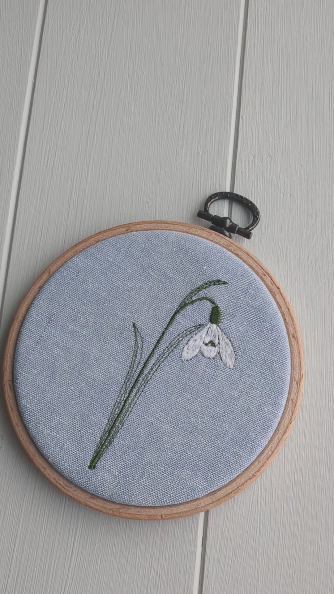 This is a lovely handmade embroidered snowdrop decoration or gift for someone special. A wooden hoop made with a lovely subtle peach-pink fabric and a pretty snowdrop embroidered in the centre. The hoop is backed with grey card and there is a metal fixing at the top of the hoop to hang it with. This is a gorgeous keepsake snowdrop decoration, perfect for a gift. Dimensions: H11.3cm x W11.3cm (at largest points) Depth: 1cm, Metal hanging loop: H1.5cm x W2cm.