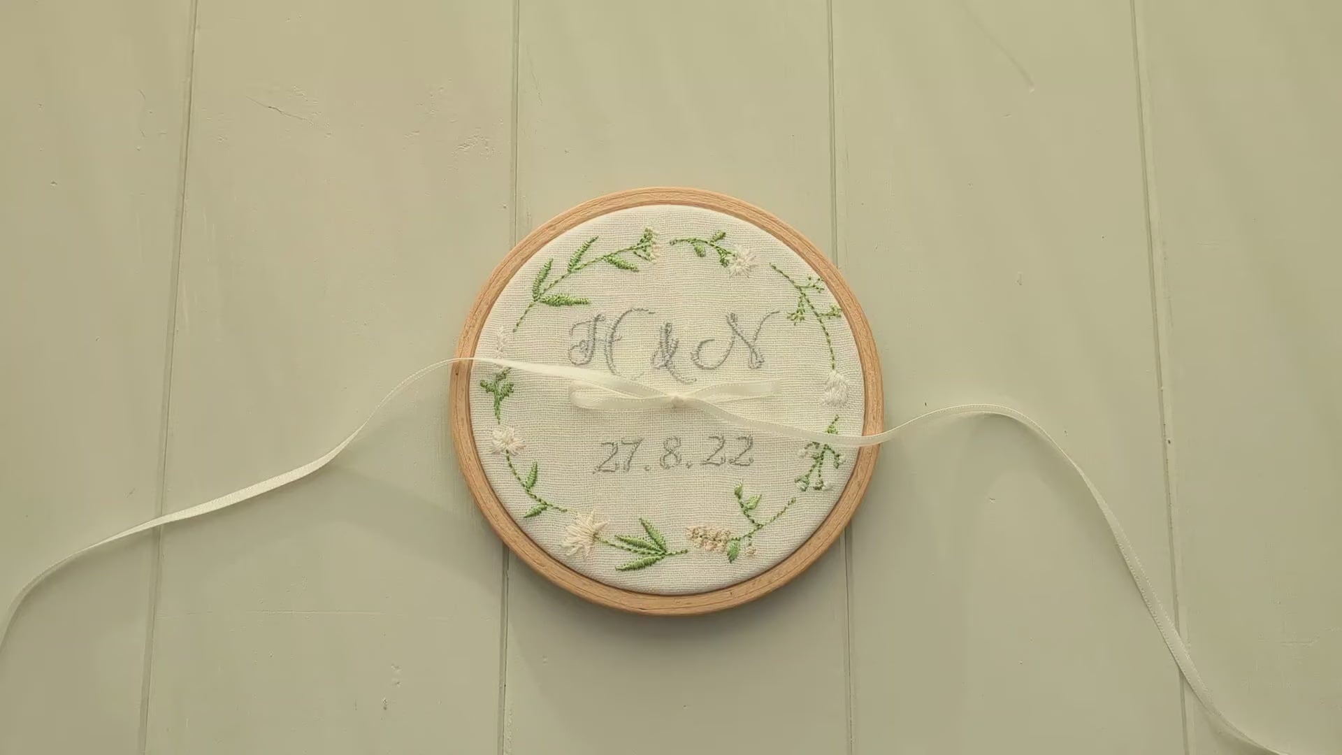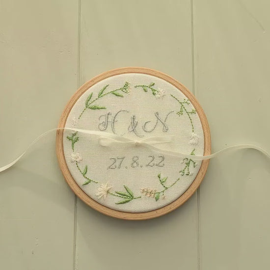 A beautiful personalised embroidered wedding ring holder. A lovely wooden hoop which is embroidered with the monograms (initials) of your choice and the date of the wedding in grey thread onto an ivory linen cotton mix fabric. A pretty floral wreath design surrounds the personalised text and is embroidered with lovely shades of green, ivory, cream and neutral threads. In the centre a narrow ivory satin ribbon holds the wedding rings in place. The hoop is then backed with grey card. This wedding ring hoop would compliment any wedding as a beautiful alternative to a ring pillow and be a lovely keepsake for the happy couple to remember their special day. Dimensions approx. wooden hoop: at largest points H11.3cm x W11.3cm. Depth approx. 1cm.